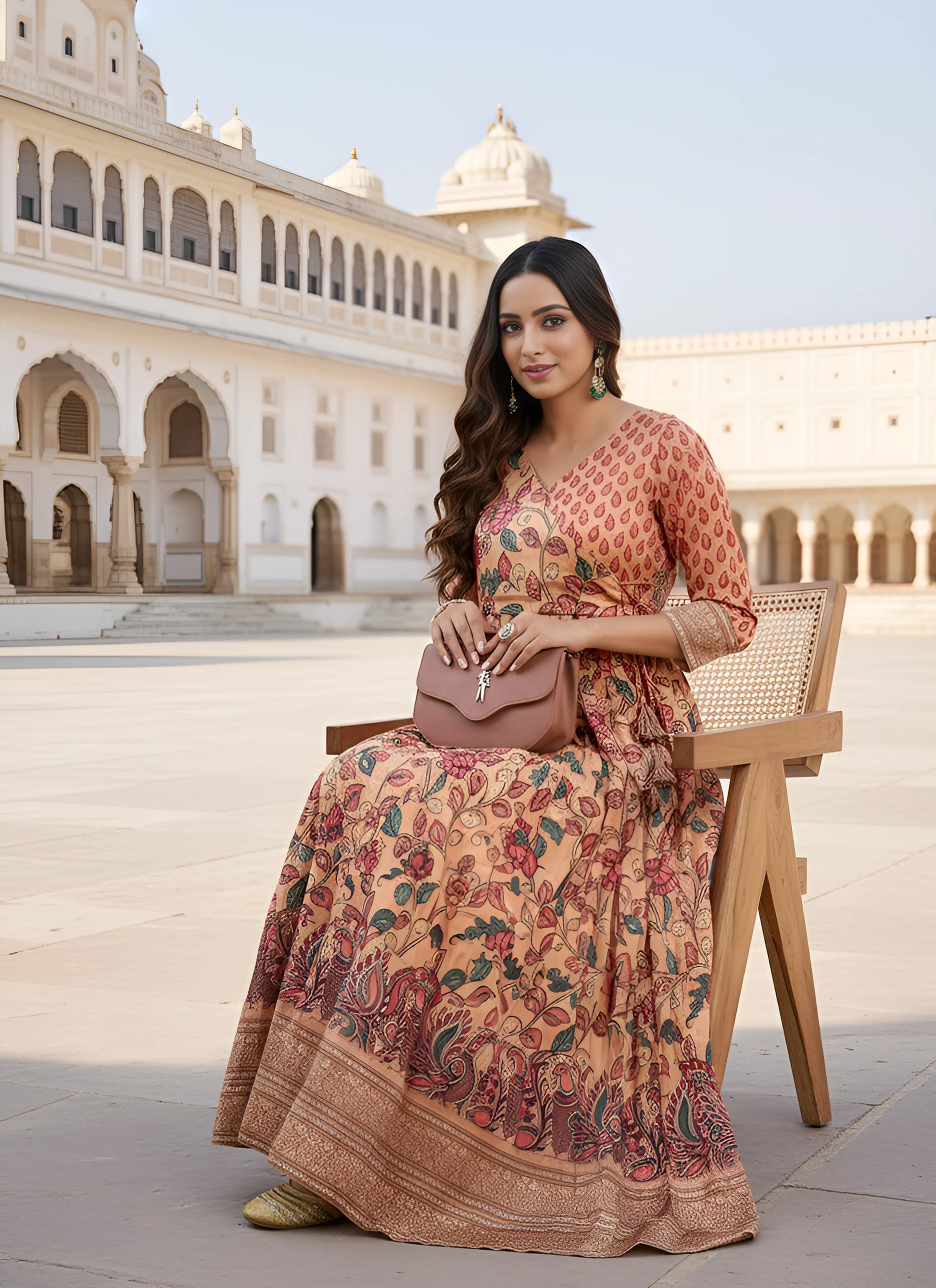 Anarkali Kalamkari Printed Floral Gown for Women - Peach