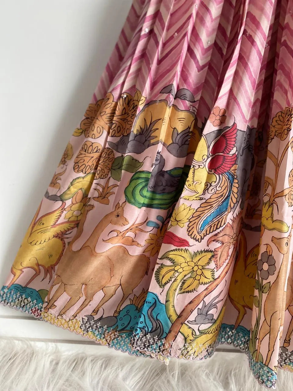 The highlight of this gown is its beautifully detailed handcrafted folk-art inspired border, showcasing vibrant animal and nature motifs that add a unique, statement finish. The flared Anarkali silhouette ensures a flattering fall and comfortable movement, while the three-quarter sleeves with contrast detailing enhance its designer look.