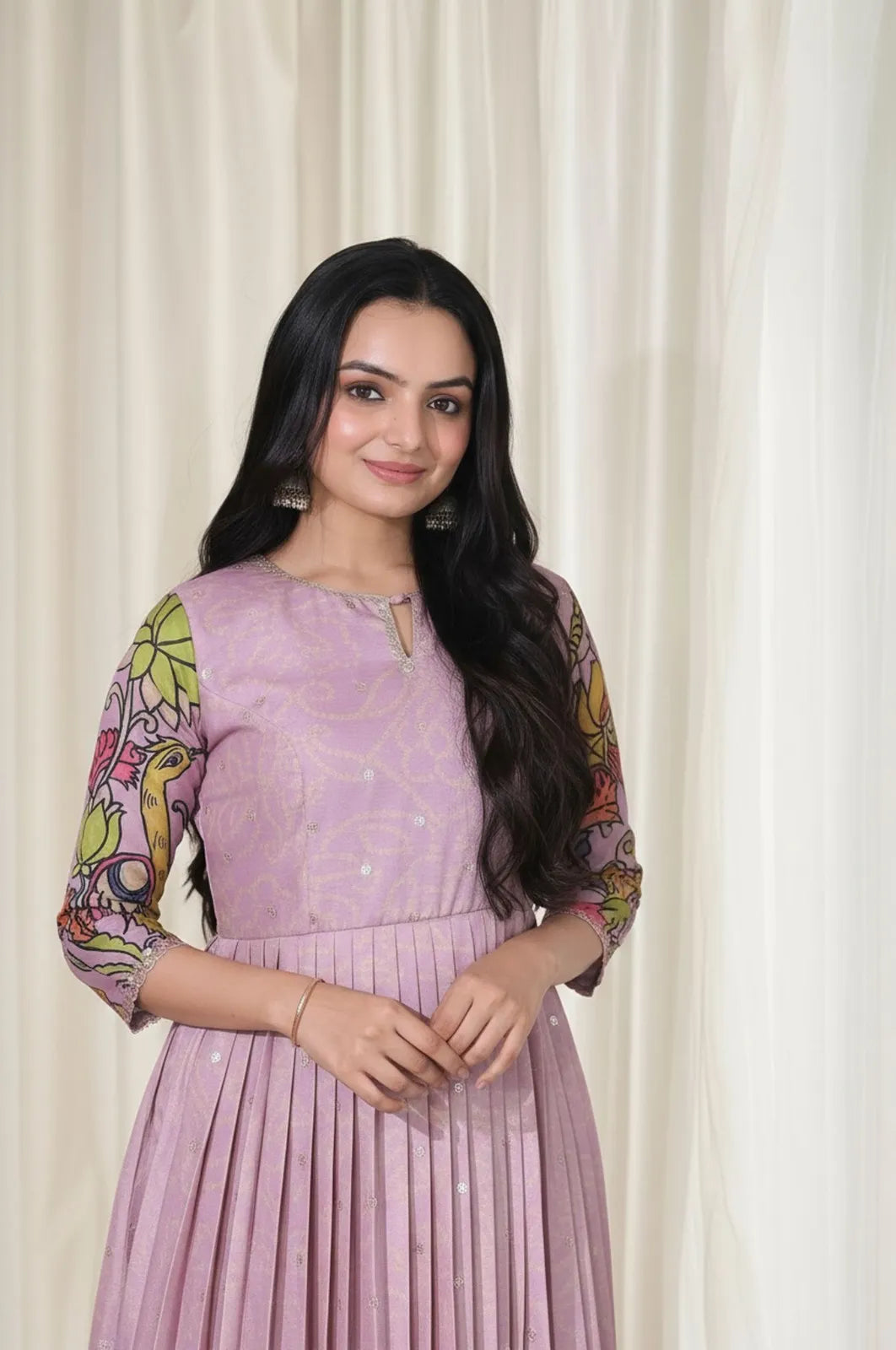 Lavender Kalamkari Print Anarkali Gown, crafted for women who love heritage-inspired fashion. Made from soft, breathable fabric, this gown features delicate traditional prints across the body, beautifully balanced with a striking Kalamkari-style floral and peacock border at the hem.