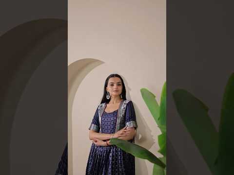 Elegant and timeless, this Navy Blue flared gown features a classic zari check pattern that adds subtle richness to the silhouette. The look is beautifully elevated with a brocade-inspired yoke and sleeve cuffs, detailed with traditional motifs for a regal touch. Finished with a wide zari woven border at the hem, the gown offers graceful movement and festive charm.