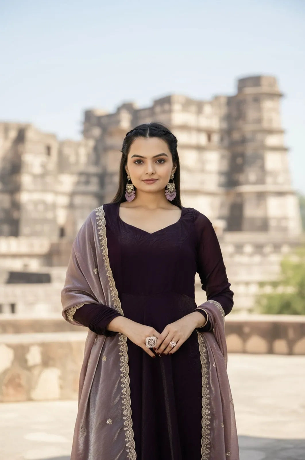 Make a graceful statement with this Elegant Space Silk Gown, designed to exude timeless charm and festive sophistication. Crafted in luxurious space silk, the gown features a beautifully flared silhouette that flows effortlessly, enhanced by refined textured detailing on the sleeves for an added touch of elegance.