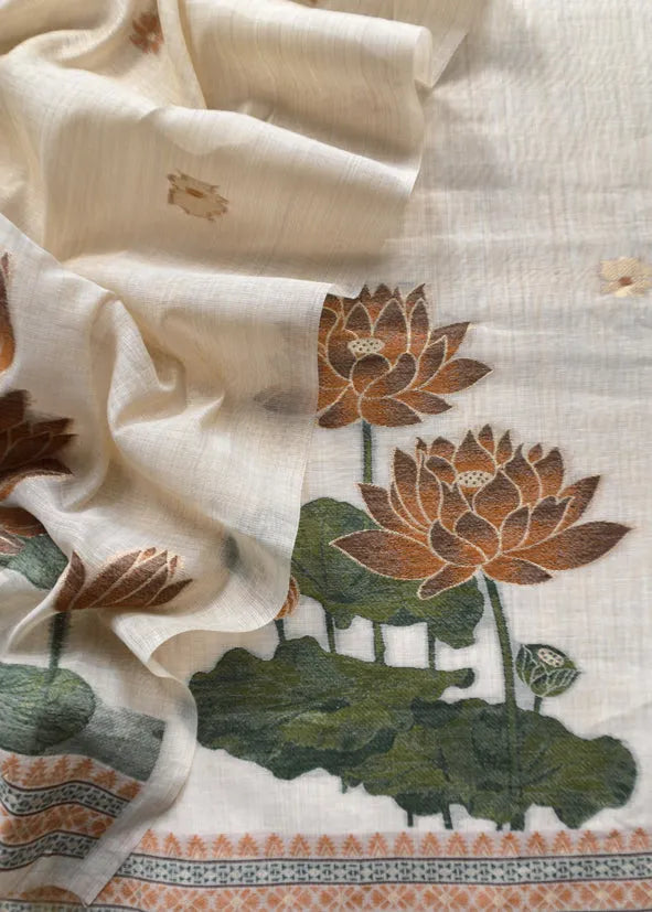 Pure Soft Muga Cotton Lotus Unstitched Dress Material Set - Cream