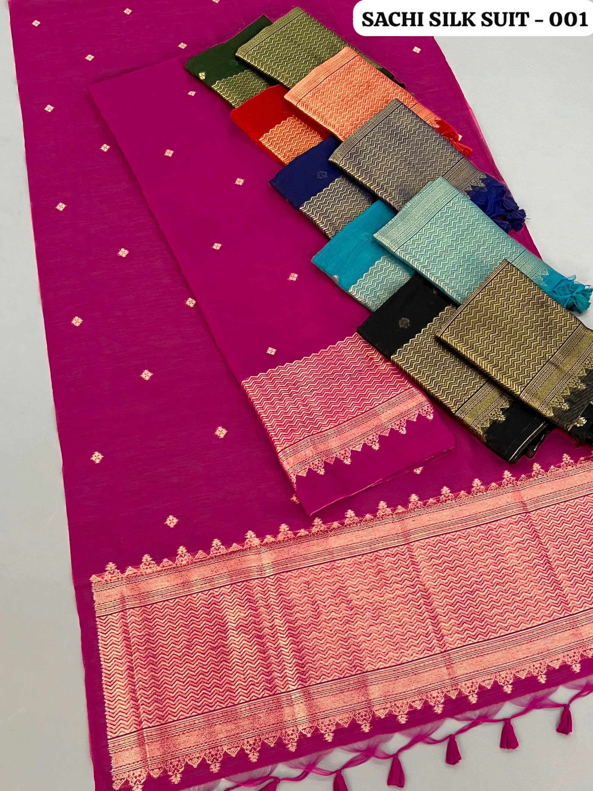 Premium unstitched salwar suit crafted from a soft linen silk blend, featuring rich zari weaving on the body for an elegant and festive look. Comes with a perfectly matched running dupatta and bottom. This 3-piece set includes top (2.5 m), bottom (2.5 m) and dupatta (2.25 m) with fancy border. Ready stock available with assured premium quality.